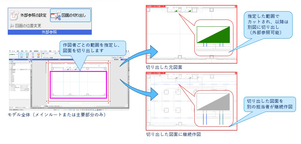 作図した電気配線の図面を別図として切り出し、作図編集後に別図を元図面に再結合する機能にも対応を予定しております。作図者ごとに範囲を指定して図面を切り出すと、その範囲で配線がカットされ、以降は別図になり外部参照するというアクションが容易に行えるようになります。