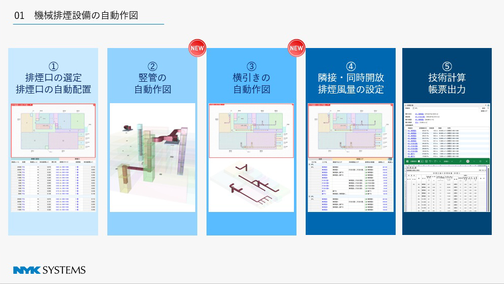 その第一弾としまして、機械排煙設備の自動作図機能を開発し、シャフトを指定した竪ダクトの自動作図やシャフトからメインルート、排煙口をそれぞれ指定しての排煙ダクトの自動作図が可能となります。