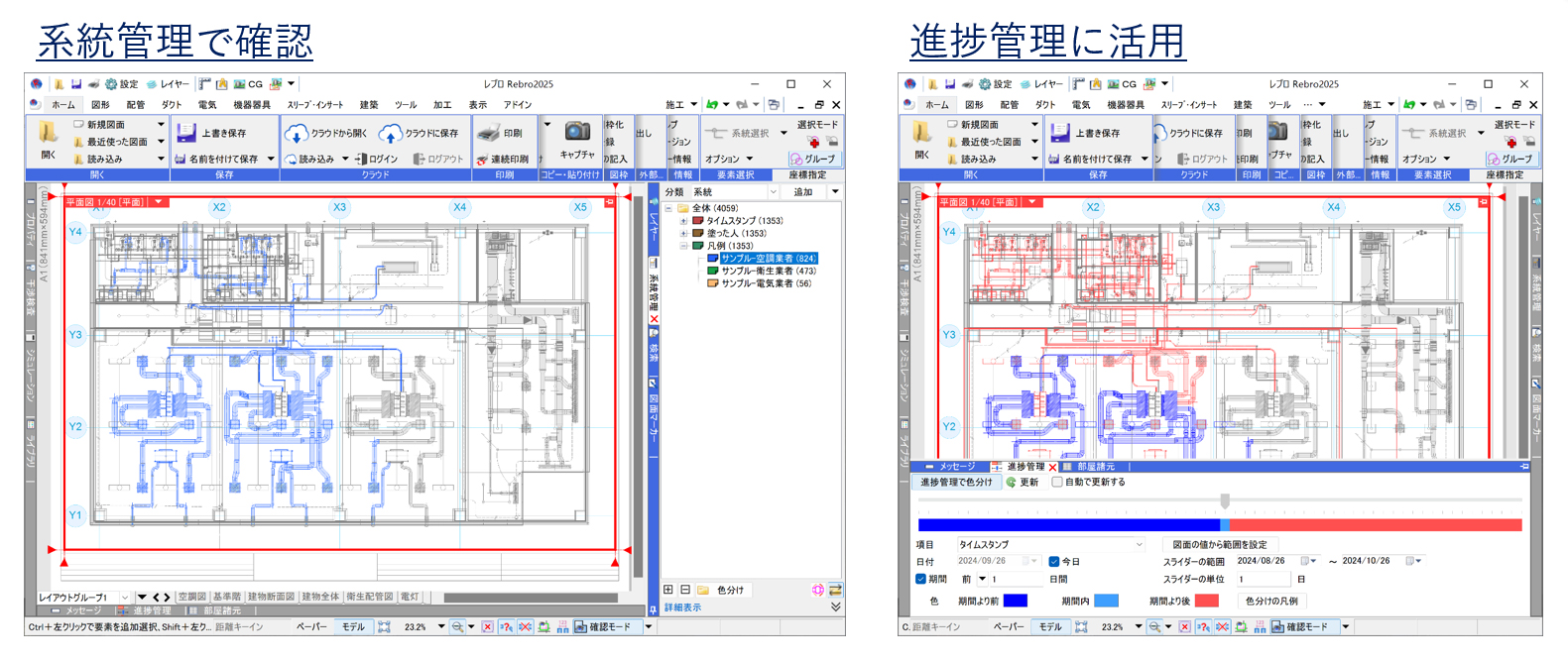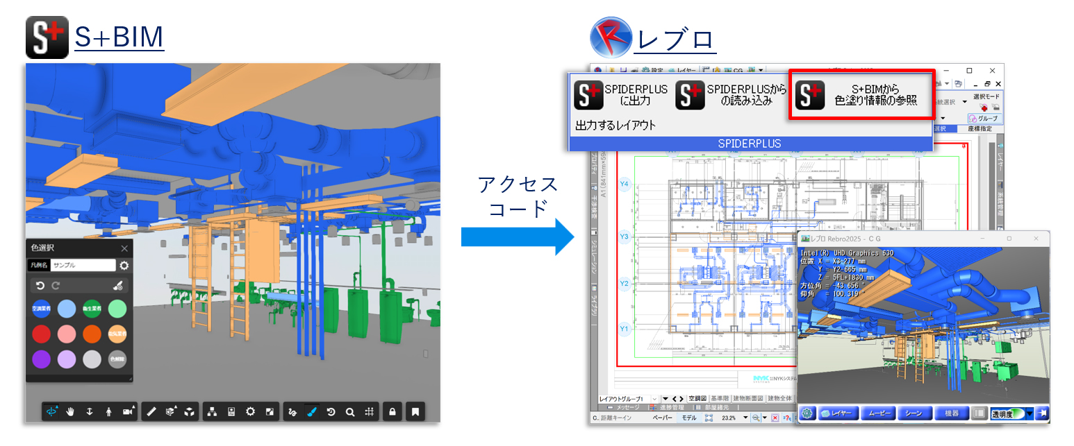 2025年6月リリースのRebro2025(Rev.2)で色塗りの機能に対応済みです。SPIDERPLUS連携アドインに[S+BIMから色塗り情報の参照]を追加し、S+BIMから発行したアクセスコードを設定することで、スパイダープラスと同じ色分けでレブロに表示することができます。レブロで色情報が確認できると、BIMモデルとしての色分け表示だけでなく、系統管理での確認や進捗管理パネルでの利用が可能です。