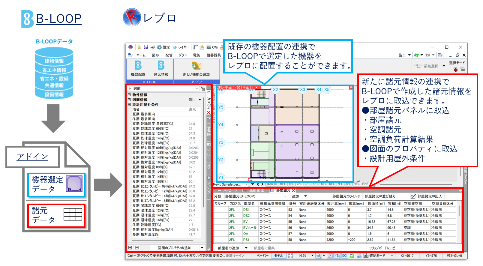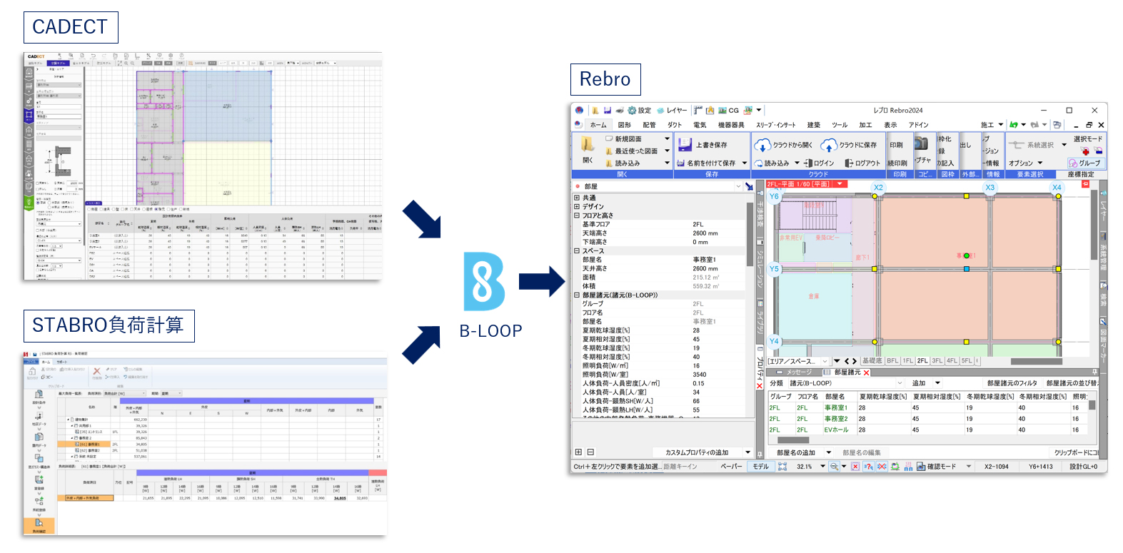 イズミコンサルティングのB-LOOPでは、部屋に着目した連携開発を行っています。現在、B-LOOPの『SeACD(空調・換気機器選定)』で選定した機器の情報をアドインでレブロに取り込み、機器を自動配置することができますが、これに加え、『CADECT(ブラウザー型CAD)』や『STABRO(熱負荷計算)』から諸元情報を取り込み、それを参照しながらの作図が可能となります。