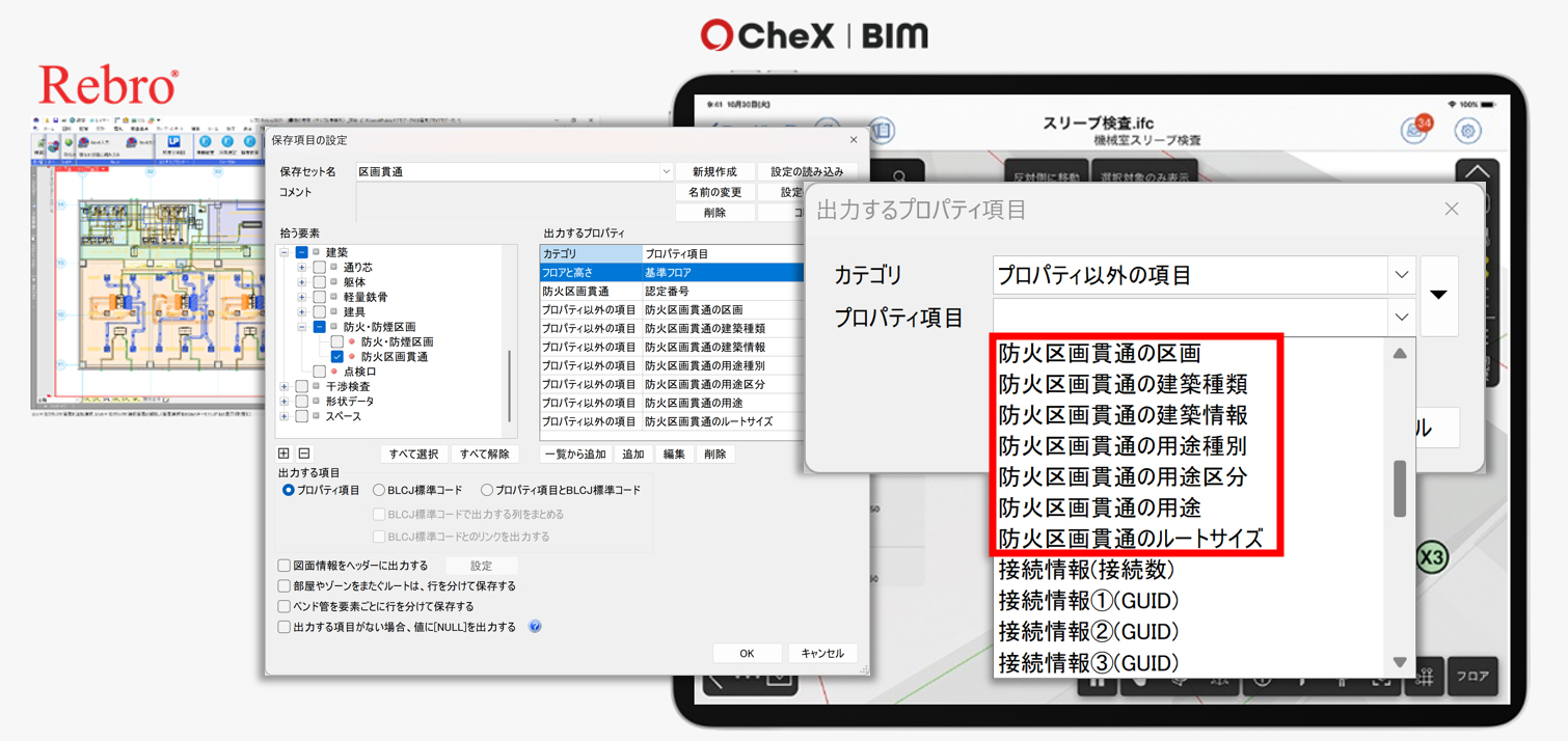YSLソリューションのCheXとの連携では、防火区画貫通の機能アップを予定しています。レブロの「防火区画貫通」の要素に加え、防火・防煙区画、建築の種類、そこを通る配管の用途やサイズ等の情報も連携し、検査業務の効率化を図ります。