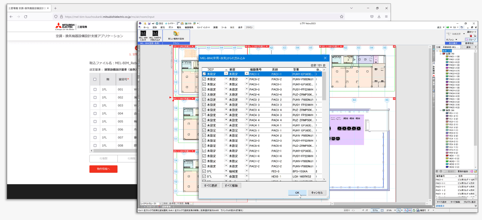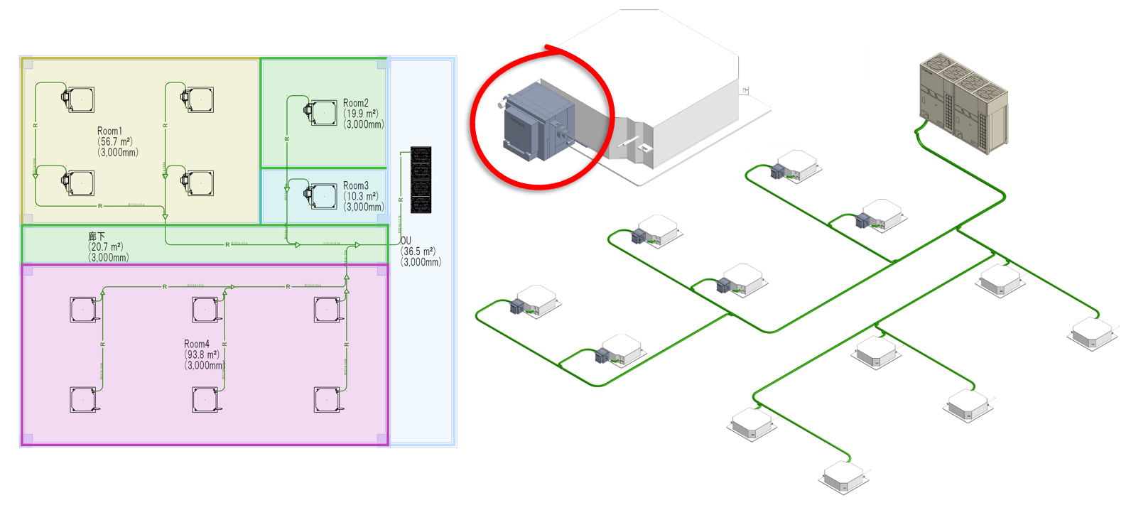 ダイキン工業のDK-BIMとの連携機能では、空調機器の配置、機器再選定、冷媒選定、騒音計算といった機能を実装済みですが、2025年4月の法改正により指定された冷媒R32での計算に対応します。DK-BIMで選定した「マルチ冷媒ユニット」がレブロの図面に自動配置されるようになります。