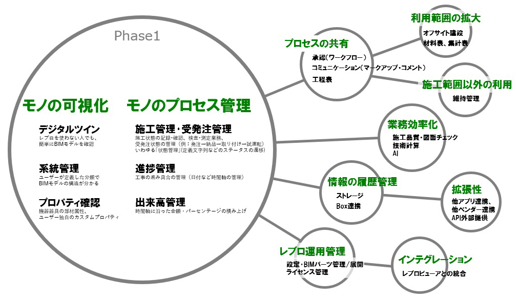 フェーズ2以降については、プロセスの共有、利用範囲の拡大、施工範囲以外の維持管理などでの活用、技術計算や図面チェックなどの業務効率化、情報の履歴管理、他アプリとの連携などの拡張性、レブロビューアとの統合など頂いた要望を基にした構想をしており、フェーズ1の開発後に着手予定です。
