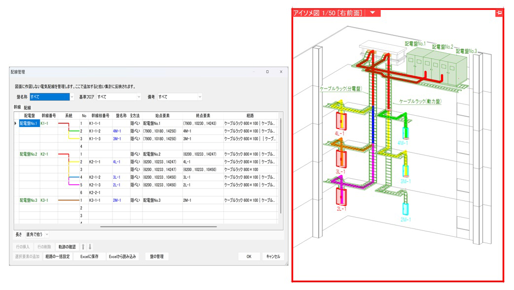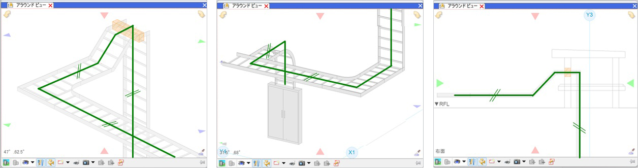 電気配線も平断面をまたいで配管やダクト同様に3次元的なルート作図が可能となります。断面図でも平面図と同じ感覚で作図が可能となり、もちろんアラウンドビューでの作図も可能です。