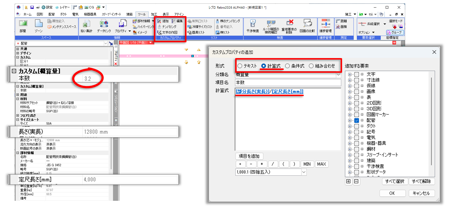 従来の「テキスト」「条件式」「組み合わせ」に加え、新たに「計算式」を追加します。プロパティの値を使って四則演算ができるようになり、例として配管の実長を定尺長さで割って概算の本数の算定などの計算が可能となります。