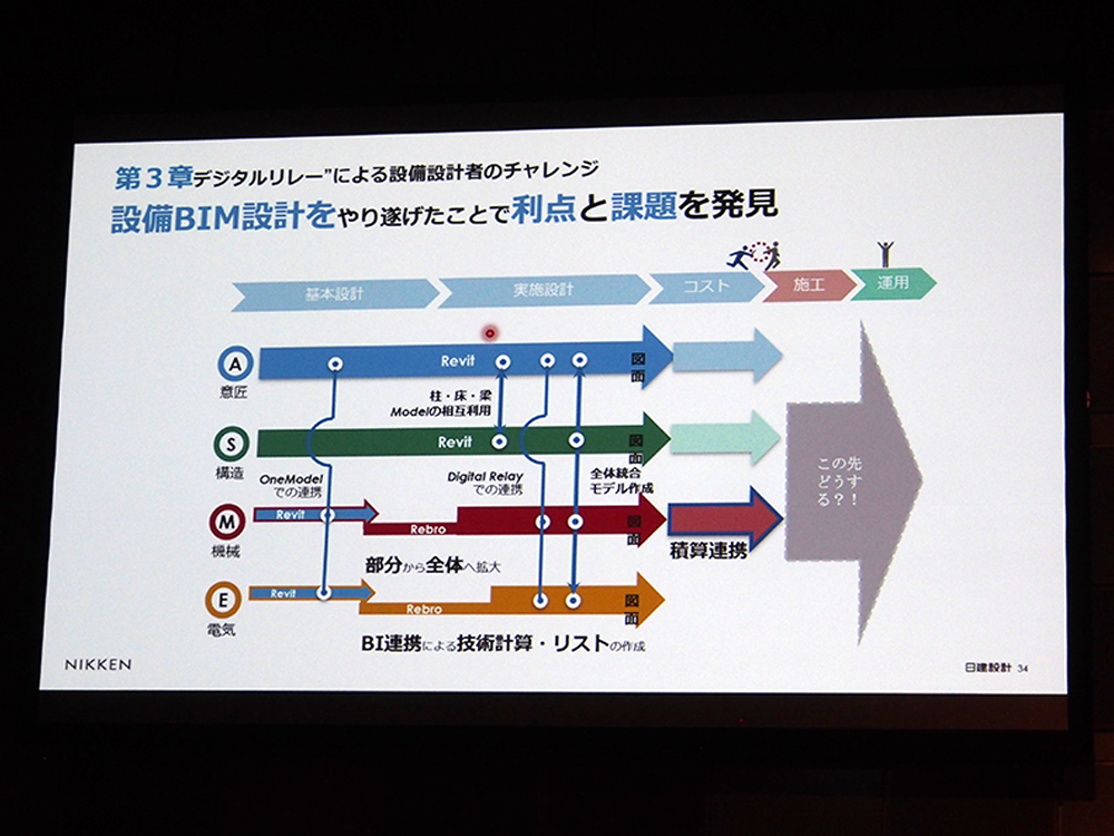 BIMとは、「BuildingInformation」と「Model」の組み合わせで、Modelが意味する原型=図面となる建物情報(BI)を作ることが最も重要と捉え、デジタルリレーの根幹である”BI”を使い部門を超えて、いかに連携したか、実際のプロジェクトにおける取り組みについて紹介されていました。