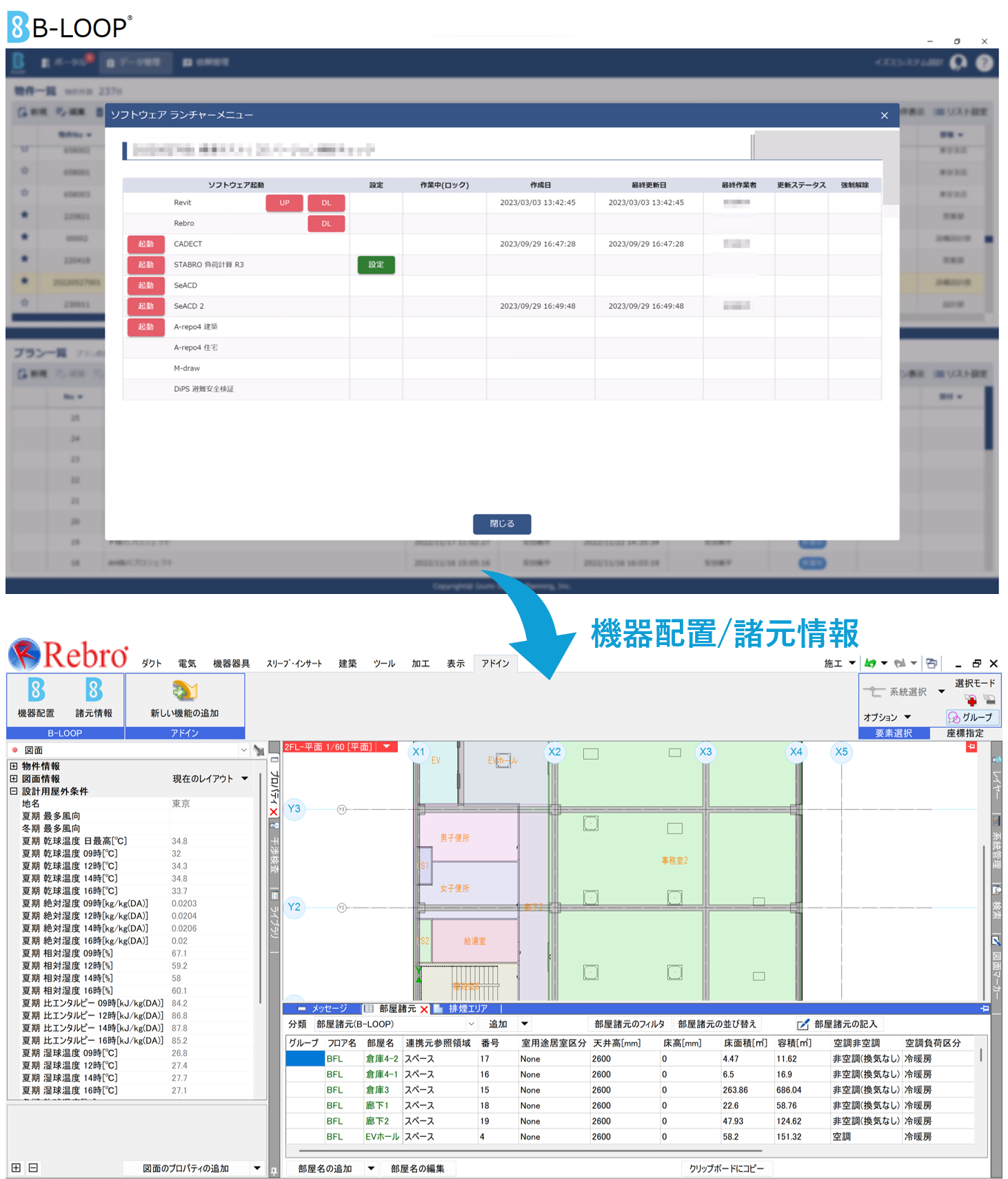 [諸元情報]では、B-LOOPで生成した部屋諸元、空調諸元、空調負荷計算結果を、レブロの[部屋諸元]パネルに読み込むことができます。